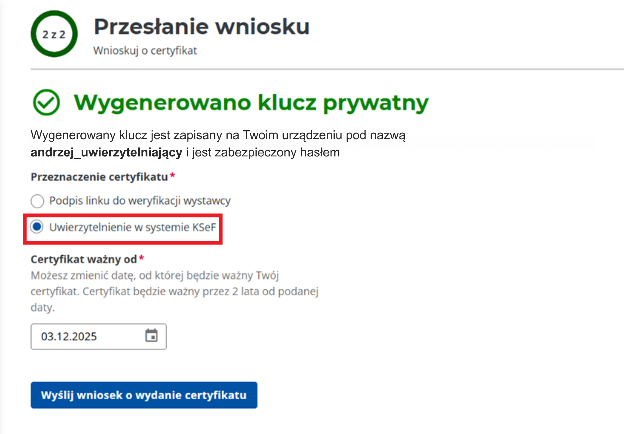 Wprowadź nazwę certyfikatu np. andrzej_wystawcy
