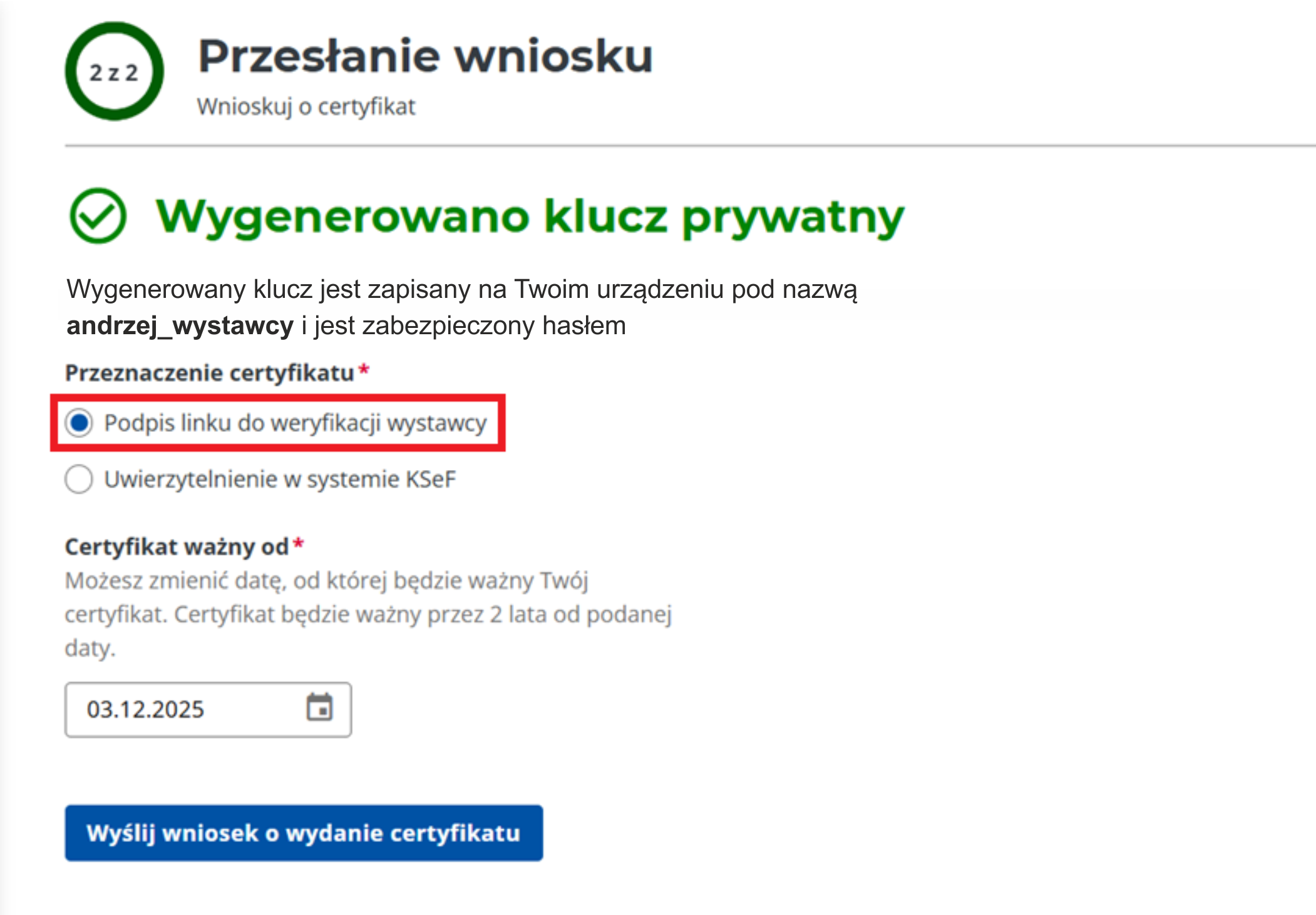 W kolejnym kroku wybierz ‘Podpis linku do weryfikacji wystawcy’ i kliknij w ‘Wyślij wniosek o wydanie certyfikatu’, który uruchamia proces wydania certyfikatu.