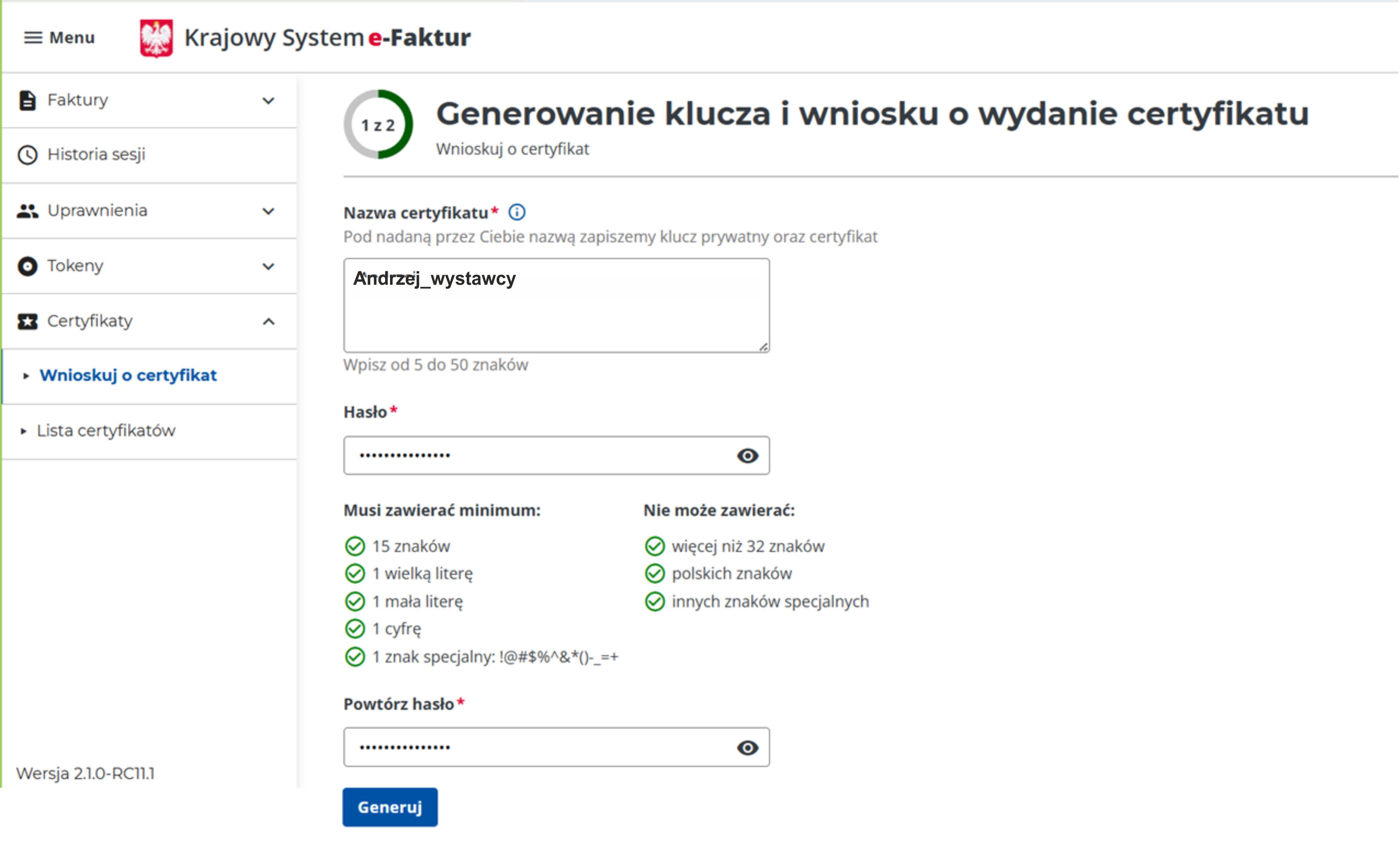 2. Wygeneruj dwa certyfikaty KSeF