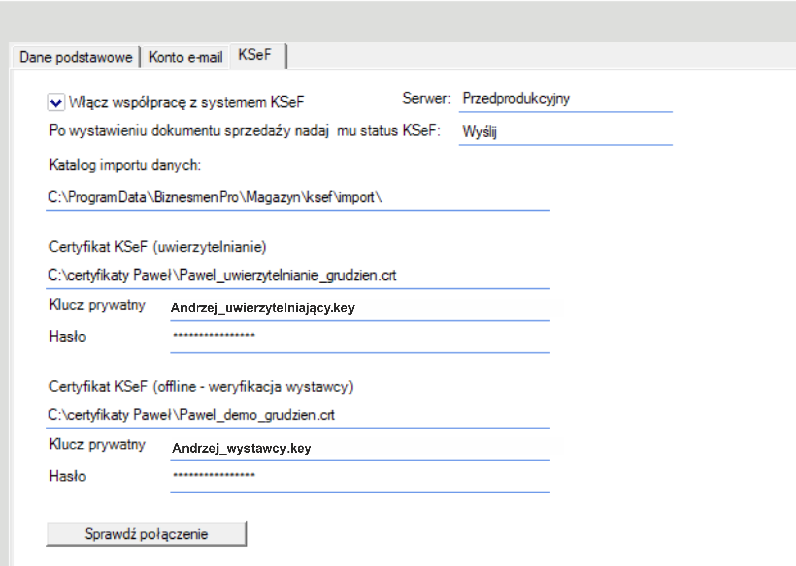 - teraz możesz wykonać test połączenia oprogramowania Biznesmen PRO z systemem KSeF. W tym samym oknie, kliknij w przycisk ‘Sprawdź połączenie’, zlokalizowany w jego dolnej części.
