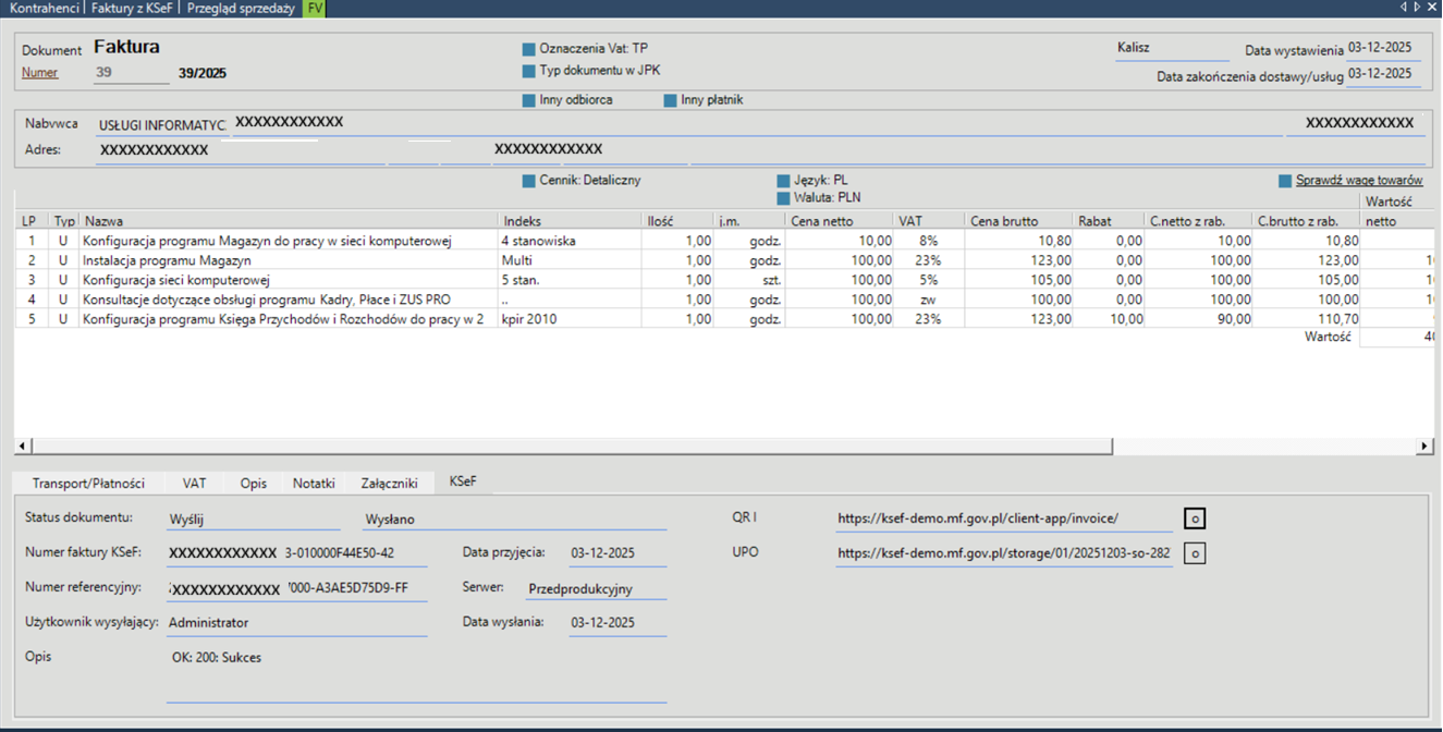 Jeśli test połączenia z KSeF zakończył się sukcesem, można wystawić fakturę, która po jej zapisaniu zostanie wysłana do KSeF (jeśli jej status ustawiono na ‘Wyślij’).