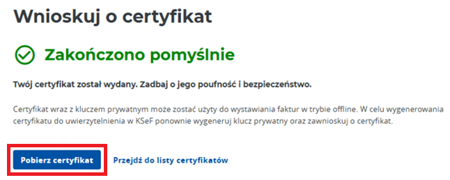 Po pomyślnym wygenerowaniu certyfikatu, kliknij w ‘Pobierz certyfikat’ i zapisz plik np. Andrzej_wystawcy.crt na dysku komputera.